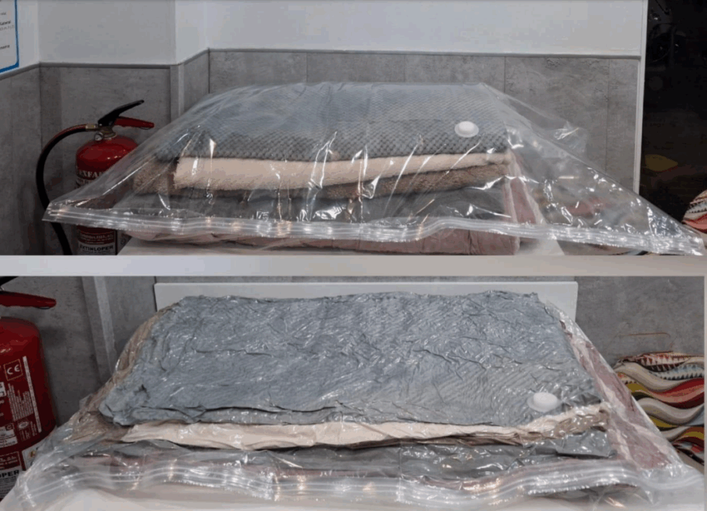 Las arrugas en el plástico indican que todo el aire ha sido extraído para proteger mejor tu ropa y ahorrar espacio.